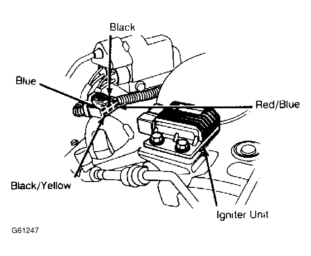 - If battery voltage exists, go to next step. If no battery voltage exists, measure voltage between Red/Blue terminal and body ground. If battery voltage still does not exist, repair open in Red/Blue wire. If battery voltage did exist, repair open in Black wire between igniter unit and G6.