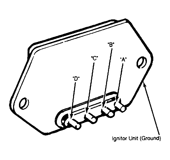 3. Using an ohmmeter, check continuity in both directions between terminals "C" and "D" on ignitor output. See Fig 2. Continuity should be present in only one direction. Connect ohmmeter positive test probe to terminal "A" and negative probe to ignitor unit ground. Measure resistance of ignitor input. Ignitor input resistance is 50,000 ohms or more at 70°F (20°C).