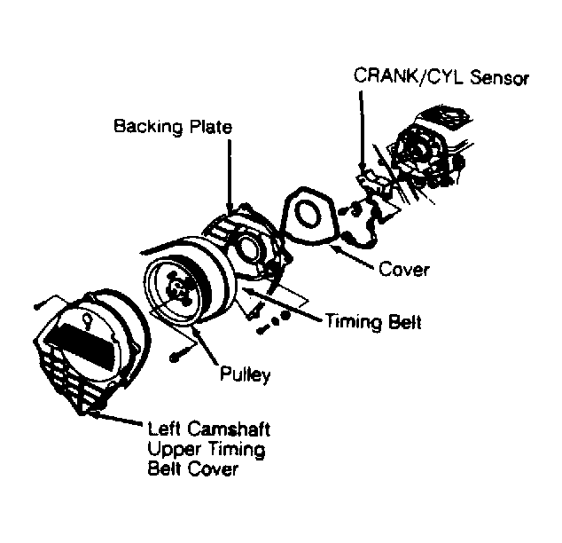 Remove cruise control actuator. Remove left camshaft upper timing belt cover. See Fig 1. Remove timing belt. Remove upper timing belt camshaft pulley bolts. Remove left camshaft timing belt upper backing plate. Remove CRANK/CYL sensor. To install, reverse removal procedure.