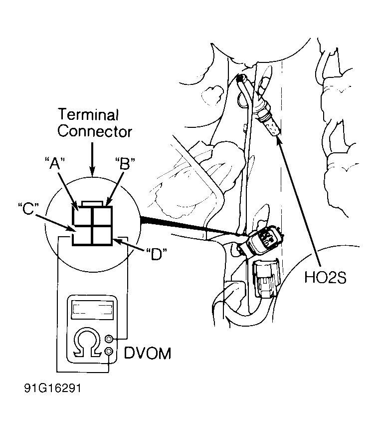 - Ensure Red/Blue wire between ECU terminal D16 and O[I2] sensor terminal "B" has good continuity. If wire is okay, replace O2 sensor.