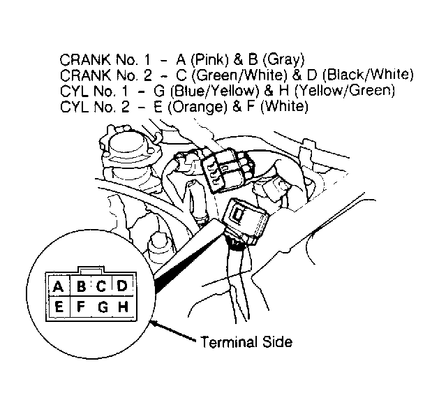 - If CHECK ENGINE light is flashing Code 59, turn ignition off. Disconnect 8-pin CRANK/CYL sensor connector nearest sensor. Measure resistance across White and Orange terminals at sensor. See Figure . If reading is not 650-900 ohms, replace sensor. If reading is within specification, go to next step.