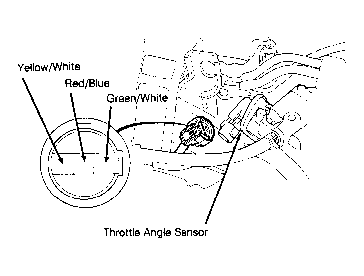 - Turn ignition on. Measure voltage between Yellow/White (positive) and Green/White (negative) terminals. If 5 volts are present, go to step 6). If reading is not 5 volts, measure voltage between Yellow/White (positive) wire terminal and ground. If reading is about 5 volts, repair open in Green/White wire between D22 and throttle angle sensor.