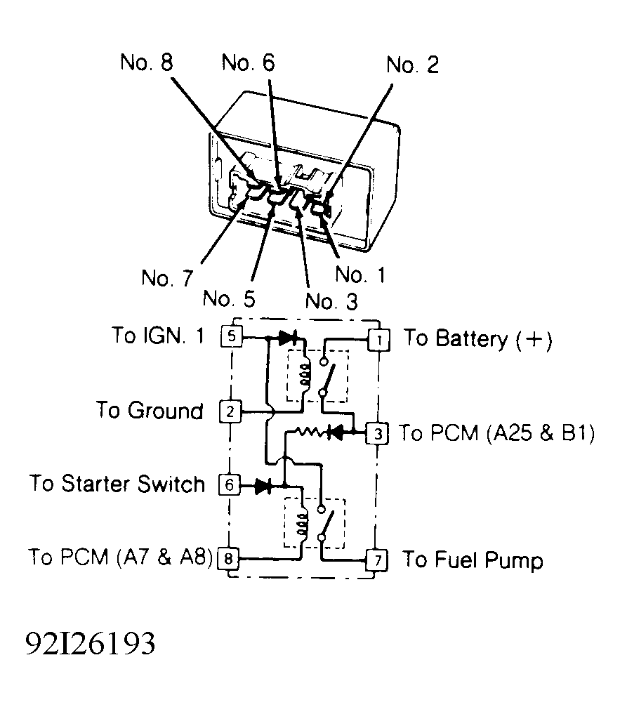 - Remove fuel pump main relay located at left side of cowl. Connect battery voltage to terminal No. 6, and ground terminal No. 8 of relay. See Fig 1