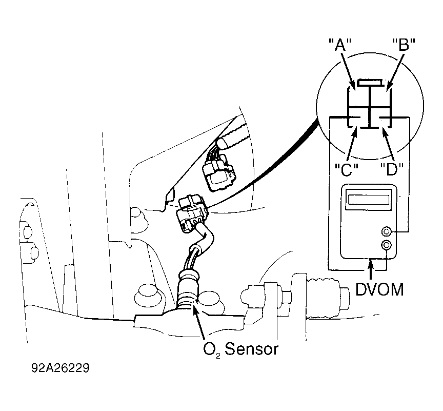 - Check continuity between body ground and O2 sensor terminals "C" and "D". If continuity is present, replace sensor. If continuity is not present, check for continuity between terminal "D" and terminal "A" and "B". If continuity is present, replace sensor.