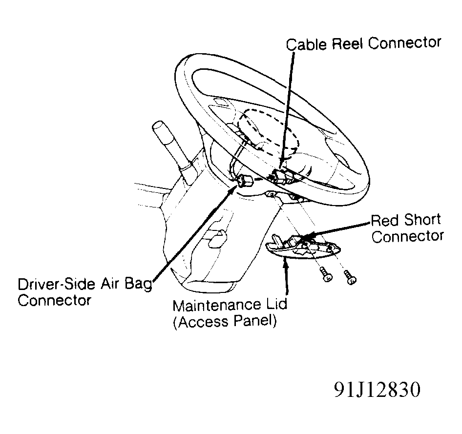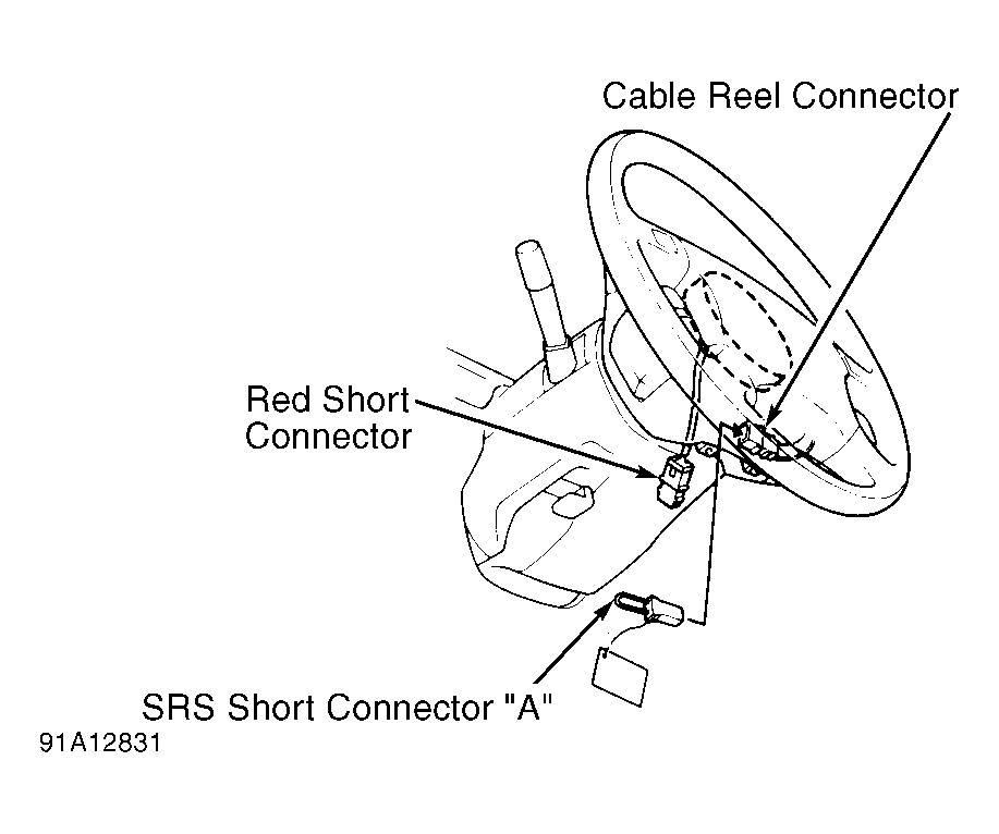 - On all models, disconnect battery cables. Remove maintenance lid below driver-side air bag. See Fig 1 Remove Red short connector. Disconnect 3-pin connector between air bag and cable reel. Connect Red short connector to air bag side of connector. On coupe models, connect SRS Short Connector "A" (07MAZ-SP00200) to cable reel side of connector. See Fig 2.