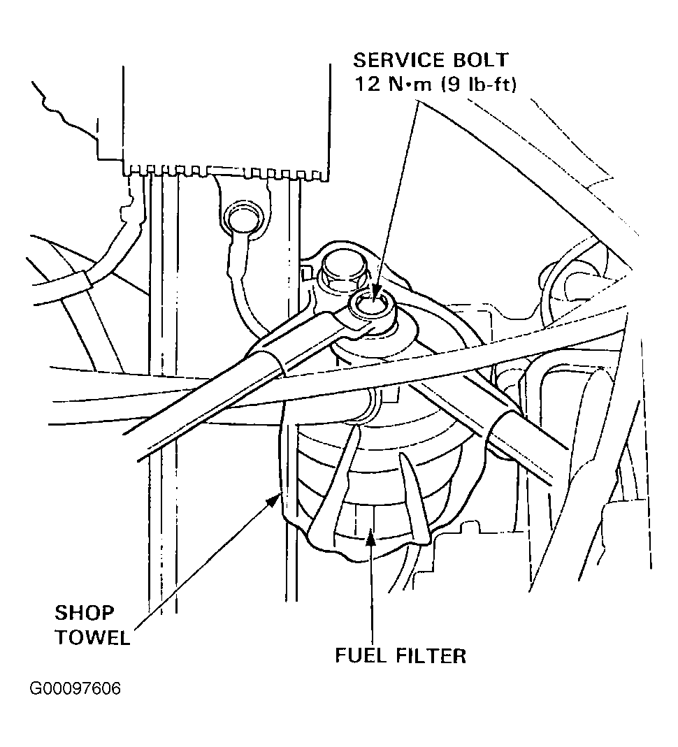 Before disconnecting fuel pipes or hoses, release pressure from the system by loosening the 6 mm service bolt at top of the fuel filter.