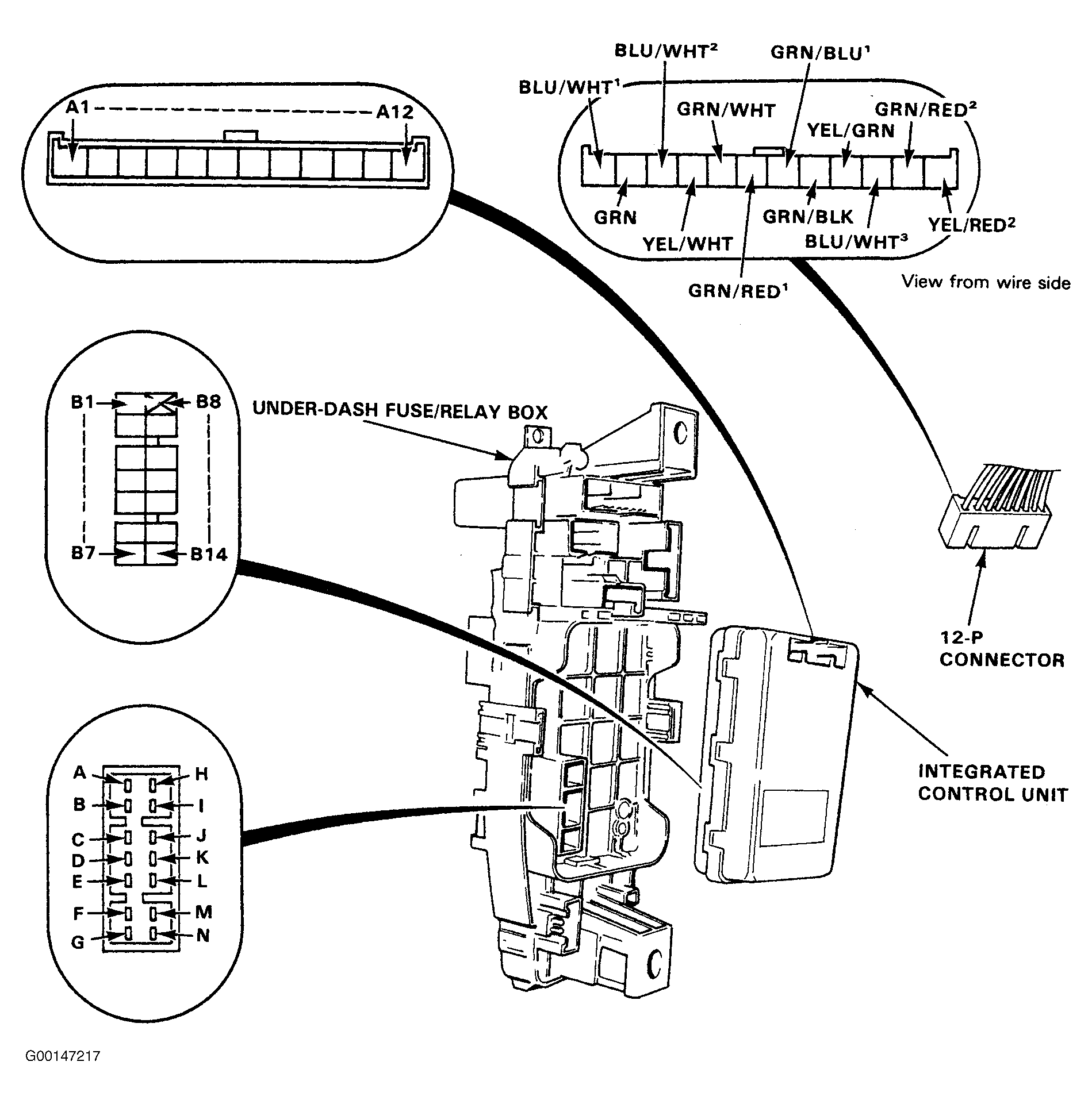 Remove the left kick panel, then disconnect the 12-P connector from the integrated control unit. Remove the integrated control unit from the under-dash fuse/relay box. Inspect the connector and socket terminals to be sure they are all making good contact. See Fig 1 .