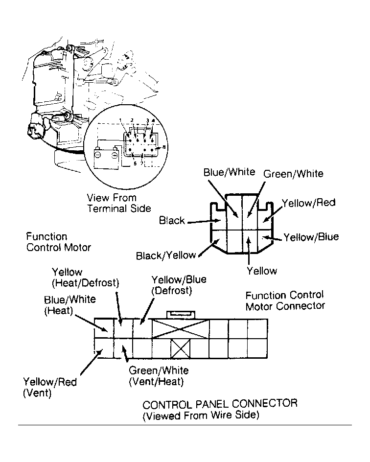 Unplug connector from function control motor. Connect battery voltage to terminal No. 5 of motor. Ground motor terminal No. 1. See Figure . Using jumper wire, connect terminal No. 1 in turn to terminals No. 2, 3, 4, 7, and 8. Motor should run each time connection is made. If motor does not perform as specified, replace function control motor.
