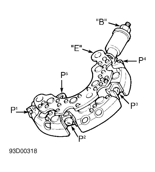 - Check for continuity between terminal "B" and terminals P1-P5 and between terminal "E" and terminals P1-P5. See Fig 1. Note ohmmeter reading.