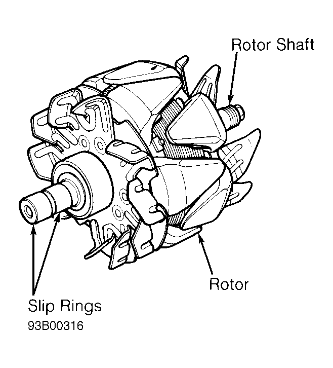 Ensure bearing rotates smoothly. Connect ohmmeter between slip rings and rotor and rotor shaft. See Fig 1. Continuity should not exist. Connect ohmmeter between slip rings. Continuity should be present. If continuity is not as specified, replace rotor.