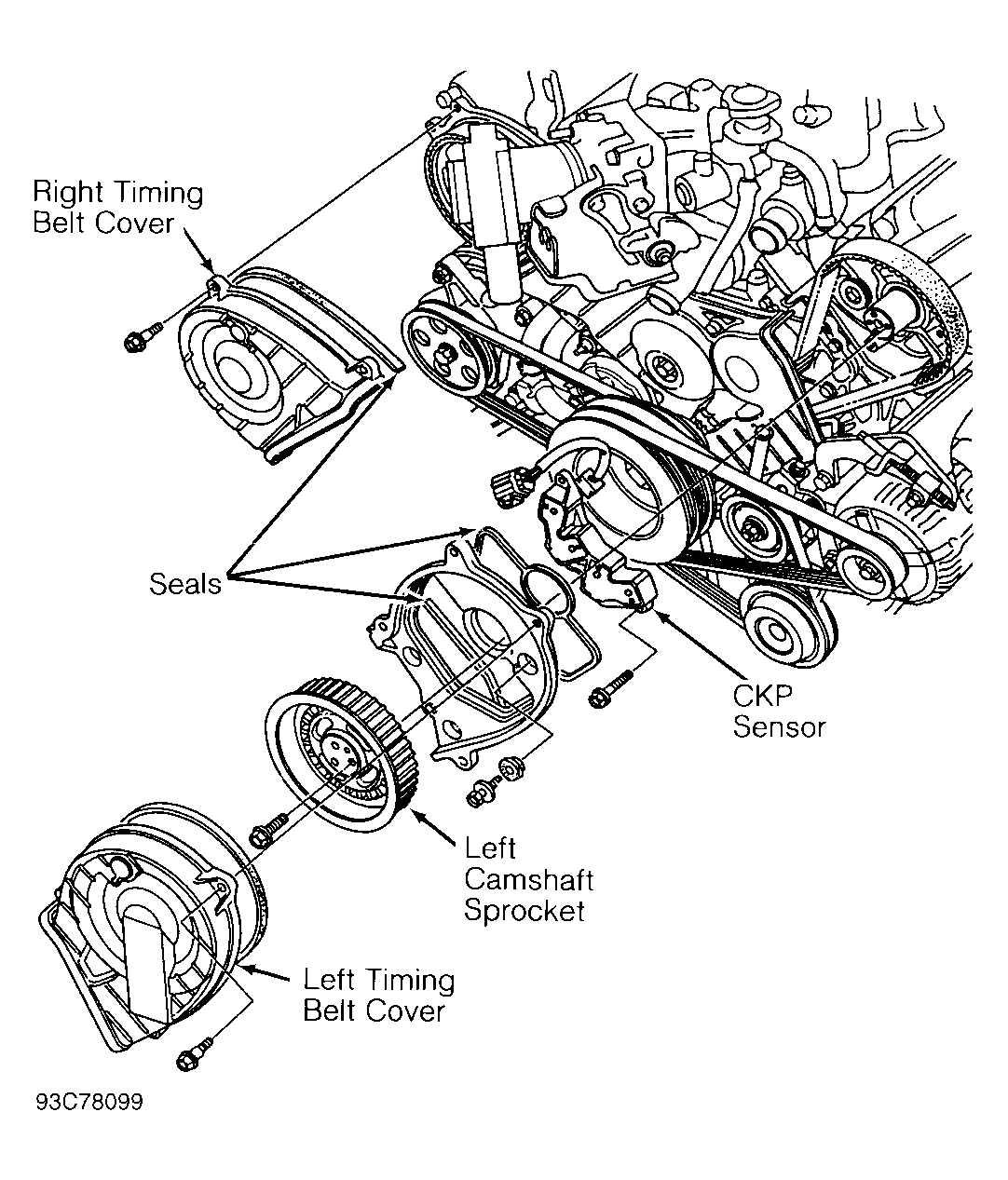 Rotate engine clockwise until No. 1 piston is at top dead center. Remove upper timing belt covers. See Fig 1. Remove timing belt from camshaft pulleys. Remove left camshaft pulley. Remove left backing plate. Remove CKP sensor. To install, reverse removal procedure. Check camshaft timing and ignition timing.