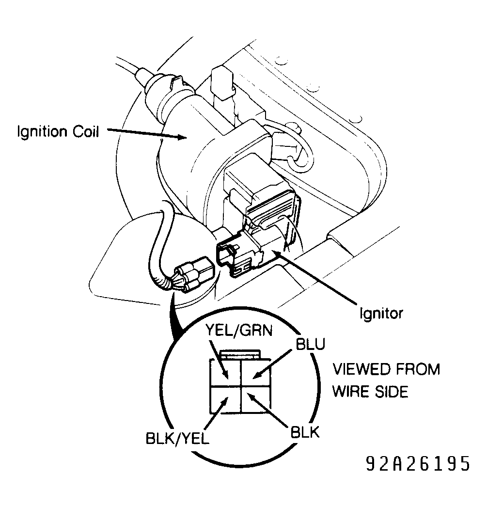 3. With ignition on, ensure battery voltage exists between Blue wire and Black wire at ignitor wiring harness connector. If voltage is not present, check for open circuit in Blue wire. If circuit is okay, go to appropriate IGNITION COIL TEST procedure.