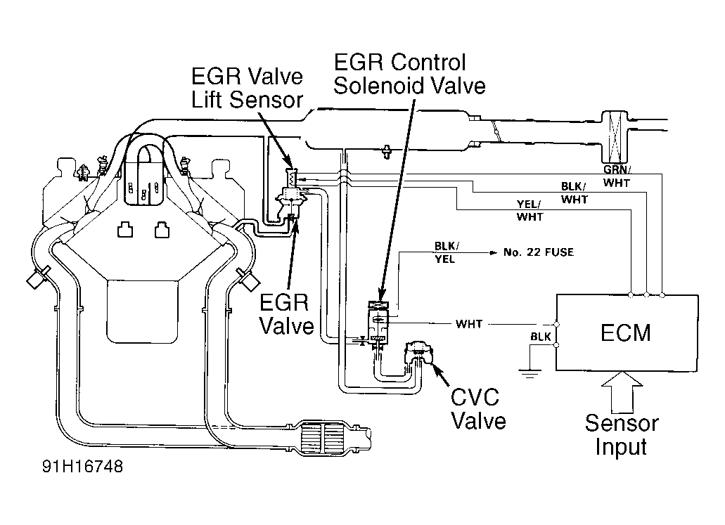 - Disconnect connector from EGR control solenoid valve. Turn ignition on. Connect voltmeter negative lead to ground. Backprobe Black/Yellow wire terminal at connector. If voltage is not present, check for blown fuse or open or short in EGR control solenoid Black/Yellow power supply wire.