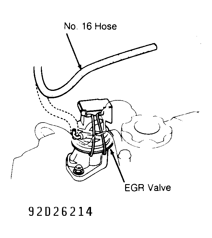 2. Test drive vehicle and retest. If Code 12 is present, start engine. Disconnect No. 16 hose from EGR valve. See Fig 1 . Connect vacuum gauge to hose. If no vacuum is present, go to step 4. If vacuum is present, disconnect 4-pin connector from control box, located on right side of firewall. Check vacuum again on No. 16 hose. If vacuum is present, check vacuum hose routing.