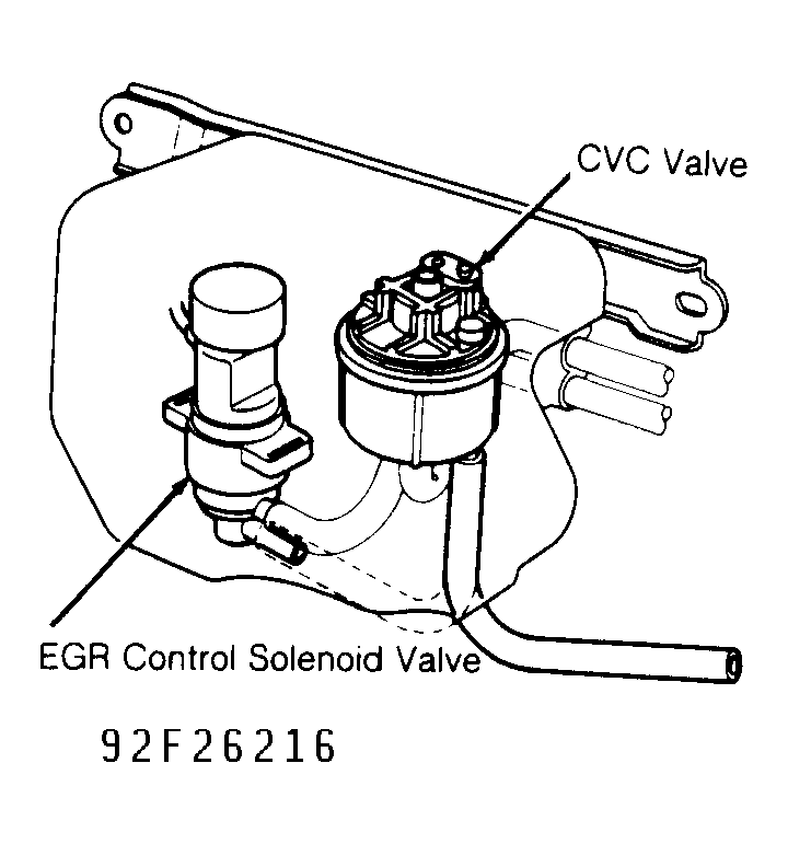 8. Connect vacuum gauge to hose. Start engine, and allow it to idle. If 6-10 in. Hg is not present, replace Constant Vacuum Control (CVC) valve. See Fig 3 . If 6-10 in. Hg is present, replace EGR control solenoid valve. See Fig 3 .