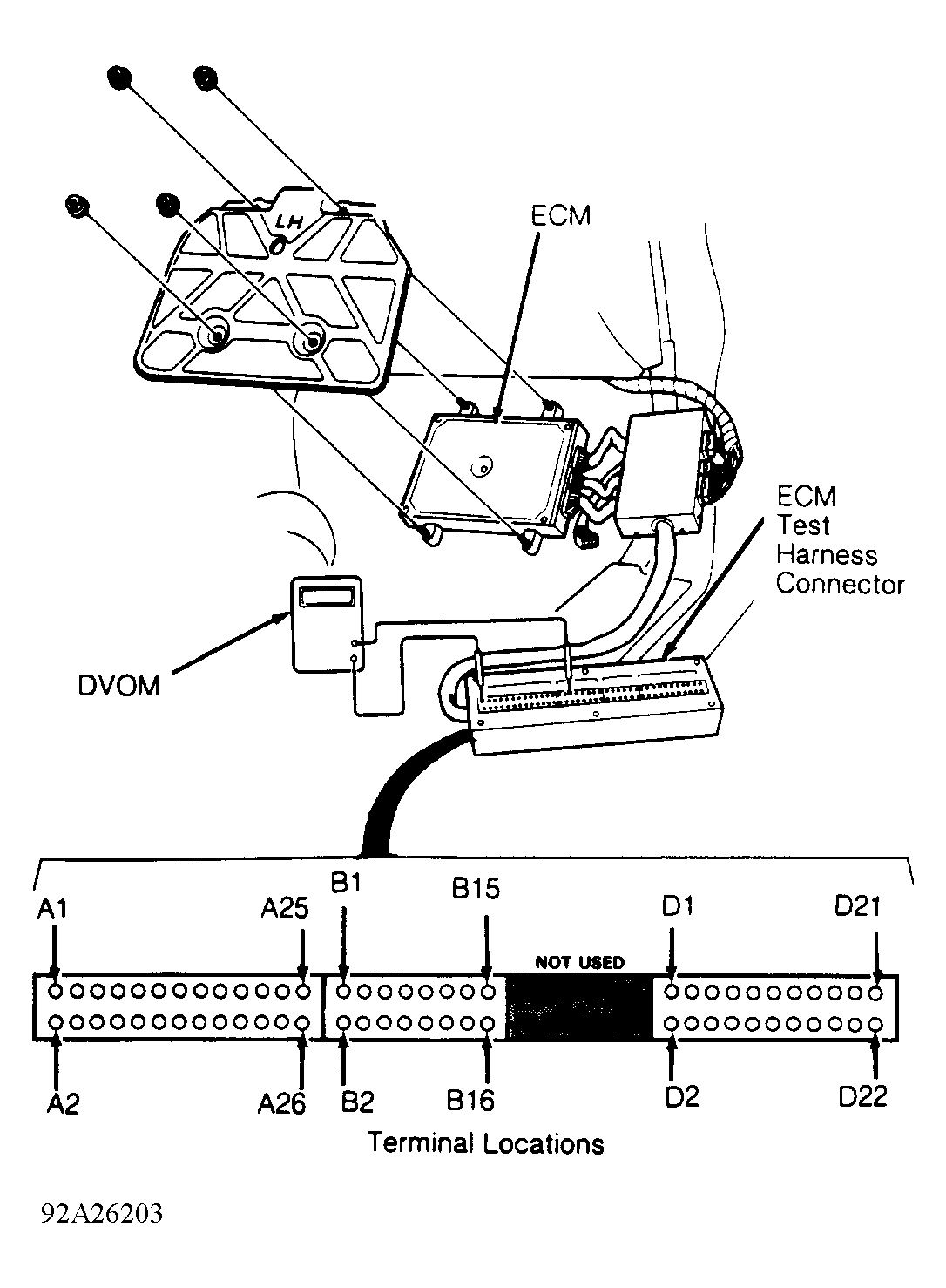 - Turn ignition on. Measure voltage between test terminals D11 (+) and D22 (-). Voltage should be about 0.5 volt at closed throttle and about 4.5 volts at wide open throttle. Transition from 0.5 to 4.5 volts (as throttle is opened) should be smooth. If voltage and operation is correct, replace ECM and retest.