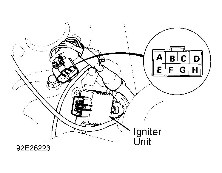 - If Code 15 is present, turn ignition off. Disconnect 8-pin connector from ignitor unit. Using ohmmeter, check for continuity between terminals "C" and "F". See Fig 1 . If continuity is not present, repair open in Black wire between ground terminal G102 and 8-pin connector.