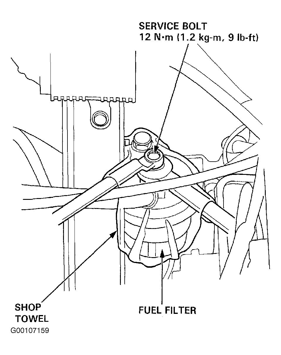 Before disconnecting fuel pipes or hoses, release pressure from the system by loosening the 6 mm service bolt at top of the fuel filter.