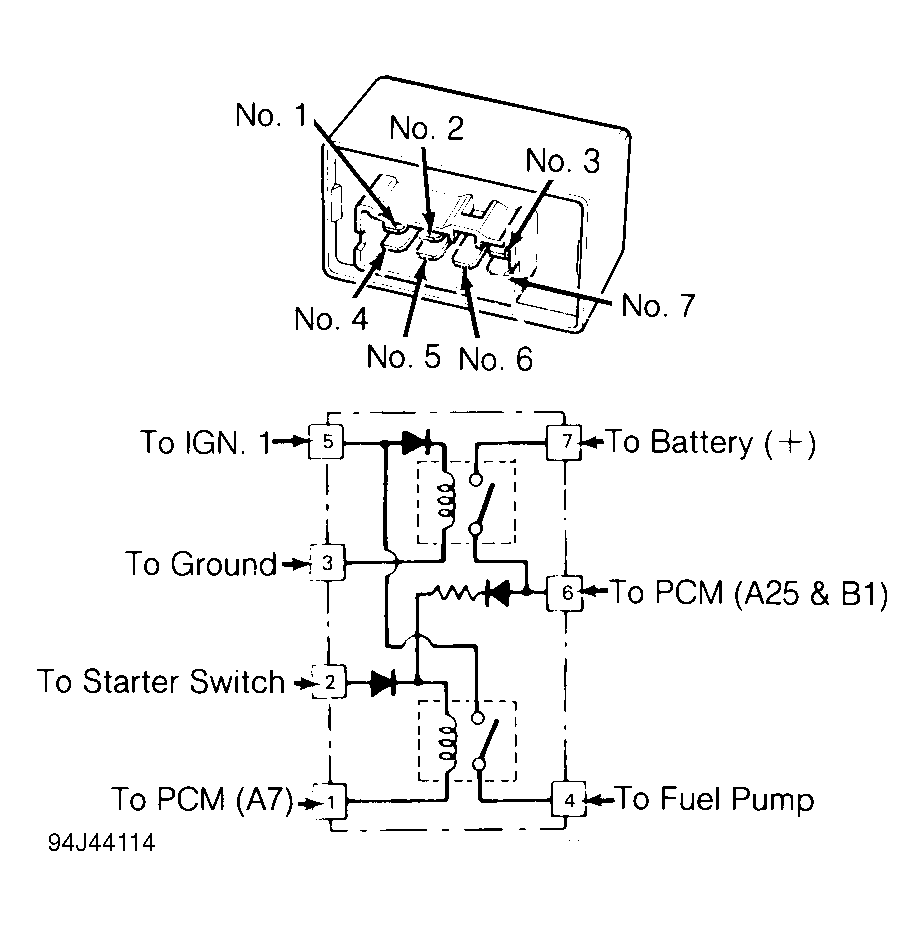 - Connect battery positive to relay terminal No. 5, and ground terminal No. 3. Check continuity between relay terminals No. 7 and 6. If continuity exists, go to next step. If continuity does not exist, replace relay.