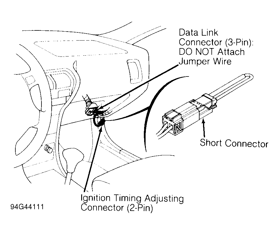 MIL may come on indicating a hard or intermittent failure. Locate 2-pin self-diagnostic connector behind glove box. See Fig 1 or Figure. Connect diagnostic connector terminals using Short Connector (07 PAZ-0010100 ). Turn ignition on. Observe MIL. Light indicates a system trouble code by number of blinks.