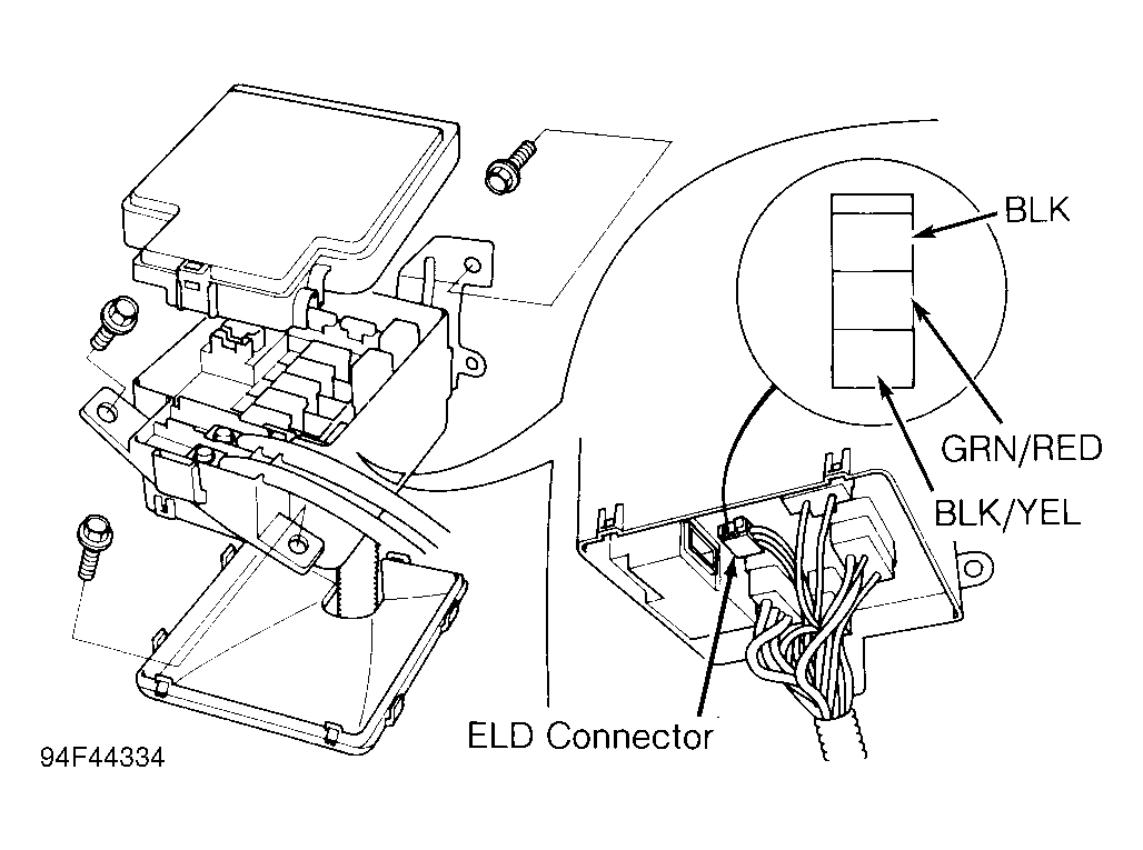 2. If Code 20 is present, turn ignition off. Remove underhood fuse/relay box and remove lower cover. Disconnect 3-pin ELD connector. Turn ignition on. Measure voltage between ELD Black/Yellow wire (positive) and Black wire (negative). See Fig 1. If voltage is about 12 volts, go to step 4). If voltage is not about 12 volts, go to next step.