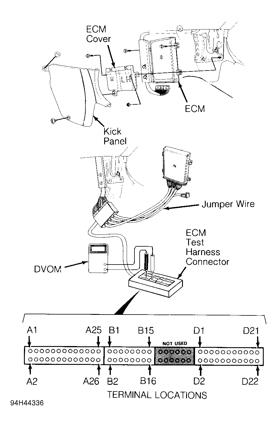 - If Code 22 is present, turn ignition off. Disconnect switch 2-pin connector. Check for continuity between Black wire terminal and body ground. If continuity is not present, repair open in Black wire between switch connector and body ground. If continuity is present, connect ECM Test Harness (07LAJ-PT3010A ) between ECM and ECM connectors. See Figure.