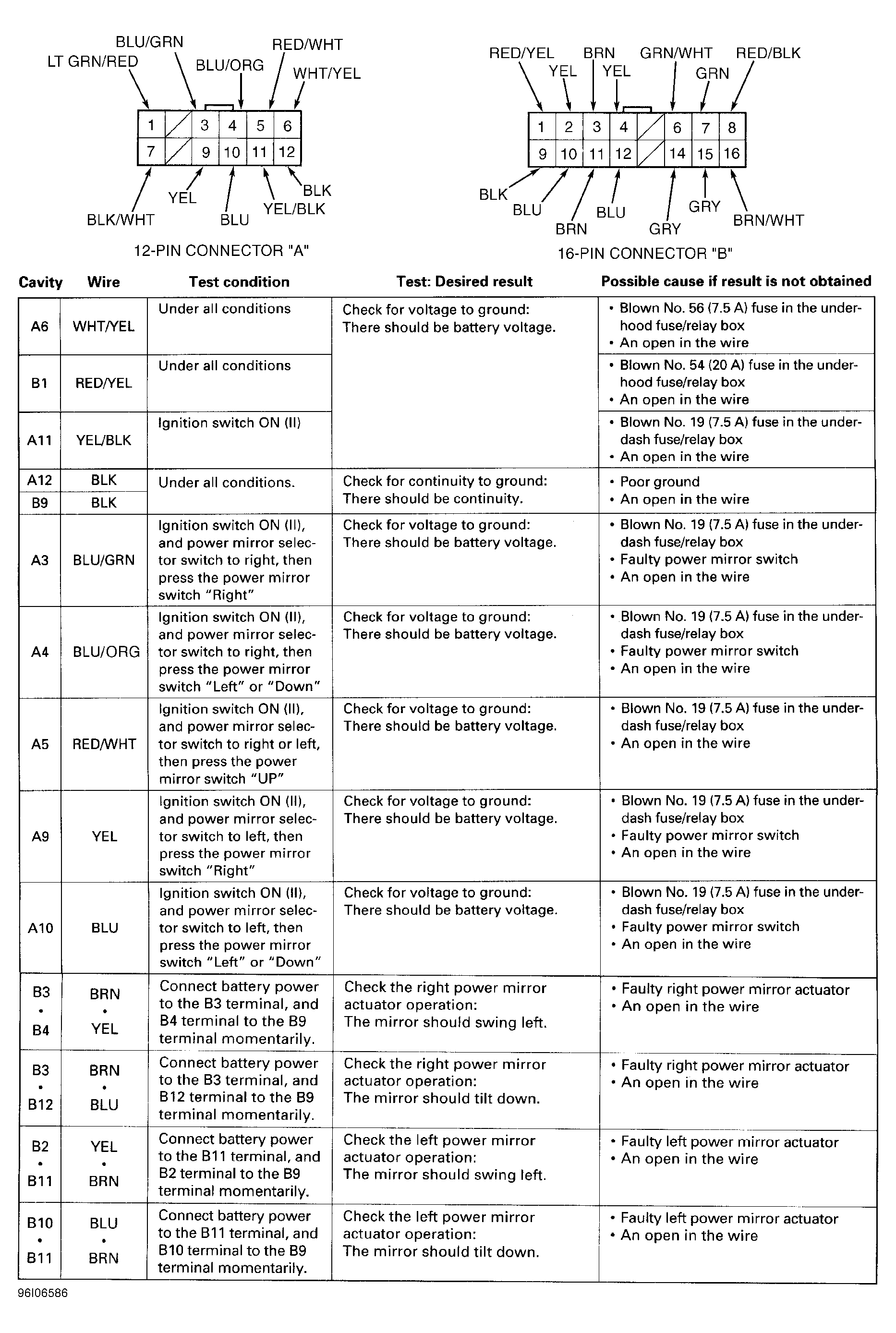Power mirror control unit is located behind driver's door panel. See DOOR PANEL under REMOVAL & INSTALLATION. Disconnect power mirror control unit connectors and check for bent, loose or corroded terminals and repair as required. SeeFig 1 and Fig 2 .
