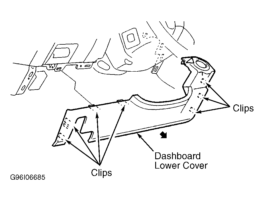 Detach clips holding dashboard lower cover in place using trim pad removal tool or other flat-bladed tool. See Fig 1 . Remove dashboard lower cover. To install, reverse removal procedure.