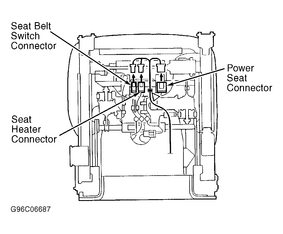 Remove seat track end covers and seat track mounting bolts. Lift front seat and disconnect seat belt switch connector, power seat connector and seat heater connector (some models). See Fig 1 . Remove headrest and carefully remove front seat through door opening. To install, reverse removal procedure. Tighten seat track mounting bolts to 27 ft. lbs. (37 N.m).