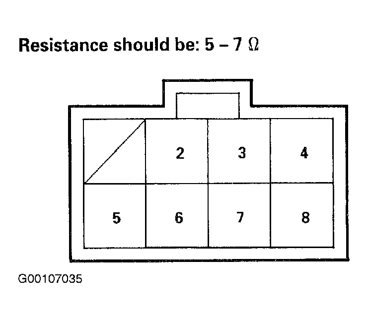 - Check for resistance between each of the fuel injector resistor terminal Nos. 2, 3, 4, 6, 7 and 8 and the power terminal No. 5.