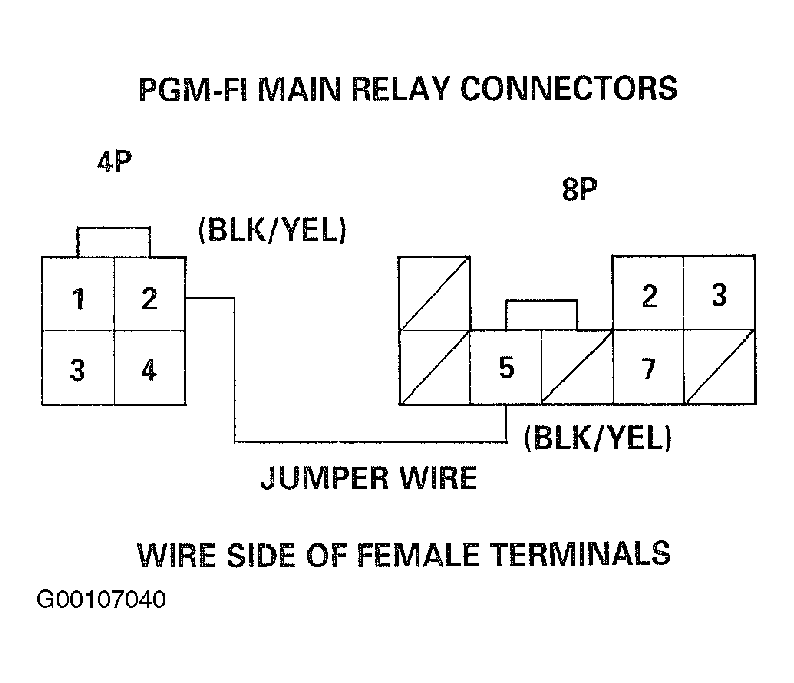 3. Disconnect the PGM-FI main relay connector and connect the No. 2 terminal (4-pin) and No. 5 terminal (8-pin) with a jumper wire. See Fig 2 .