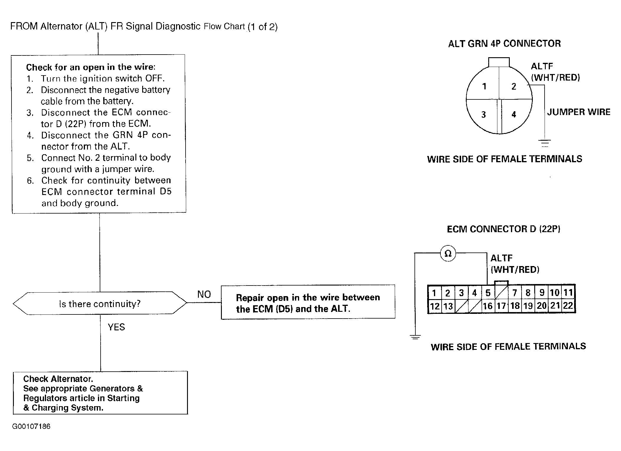 This signals the ECM when the alternator (ALT) is charging. For troubleshooting of the FR signal circuit, see Fig 1 and Fig 2 .