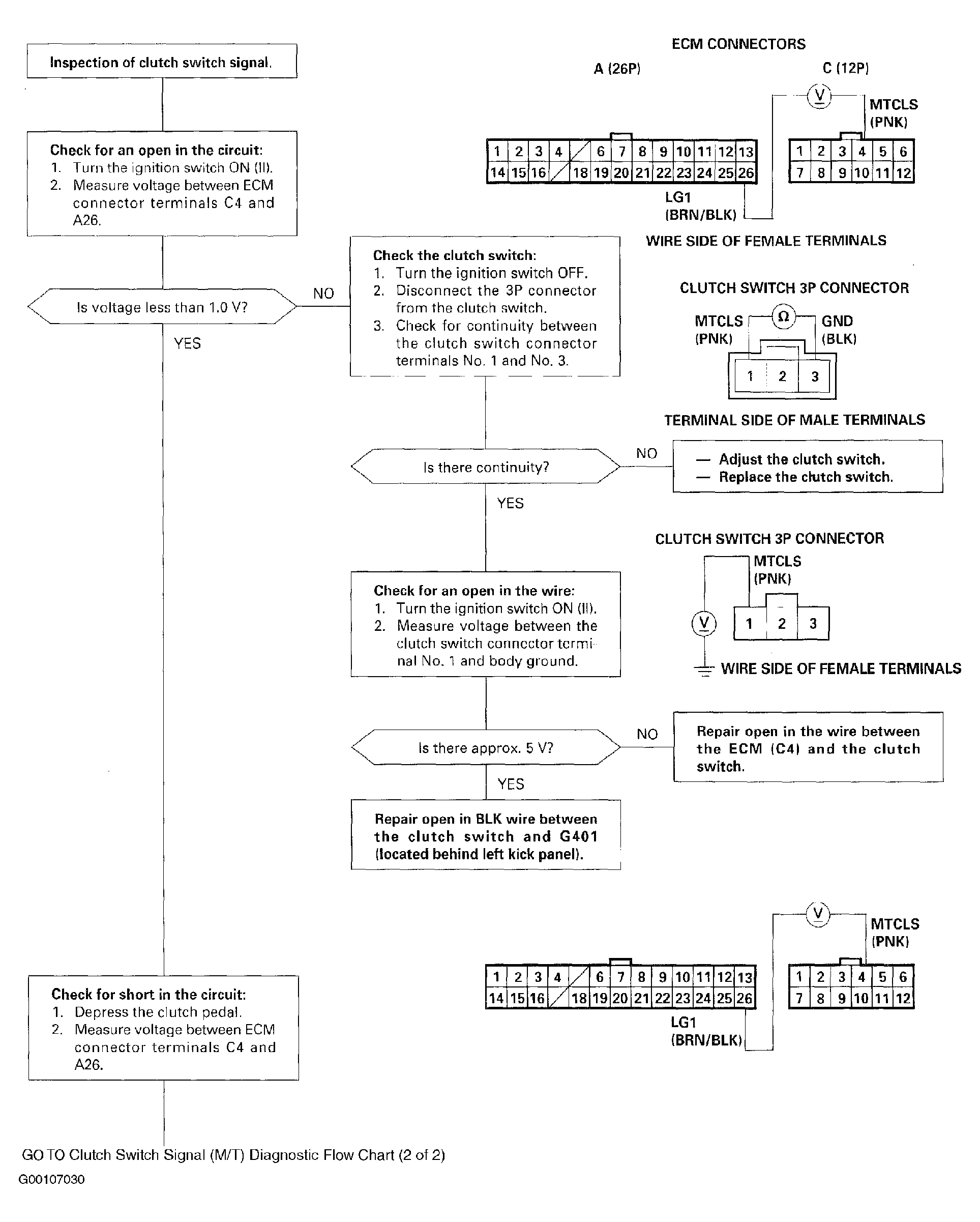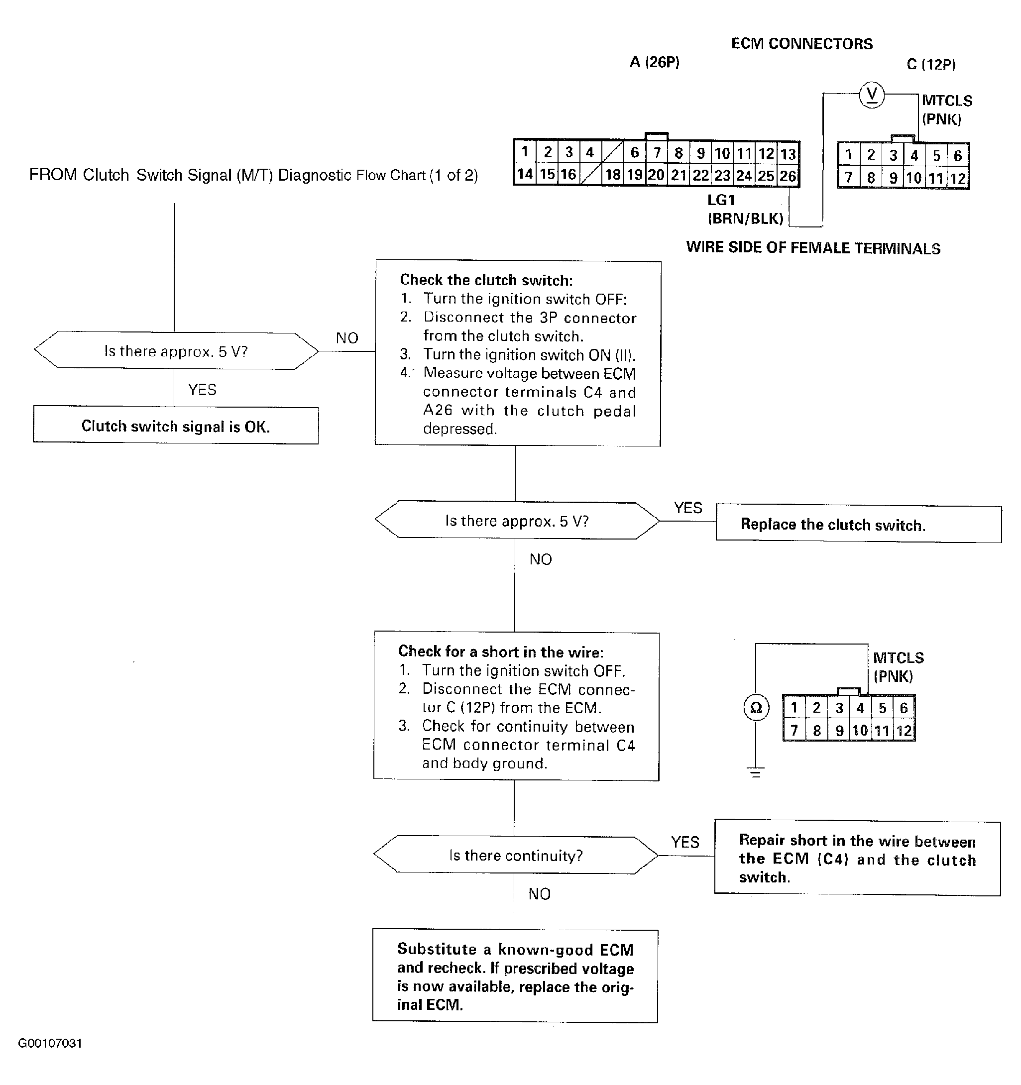 This signals the ECM when the clutch is engaged. For troubleshooting of the clutch switch signal circuit, see Fig 1 and Fig 2 .
