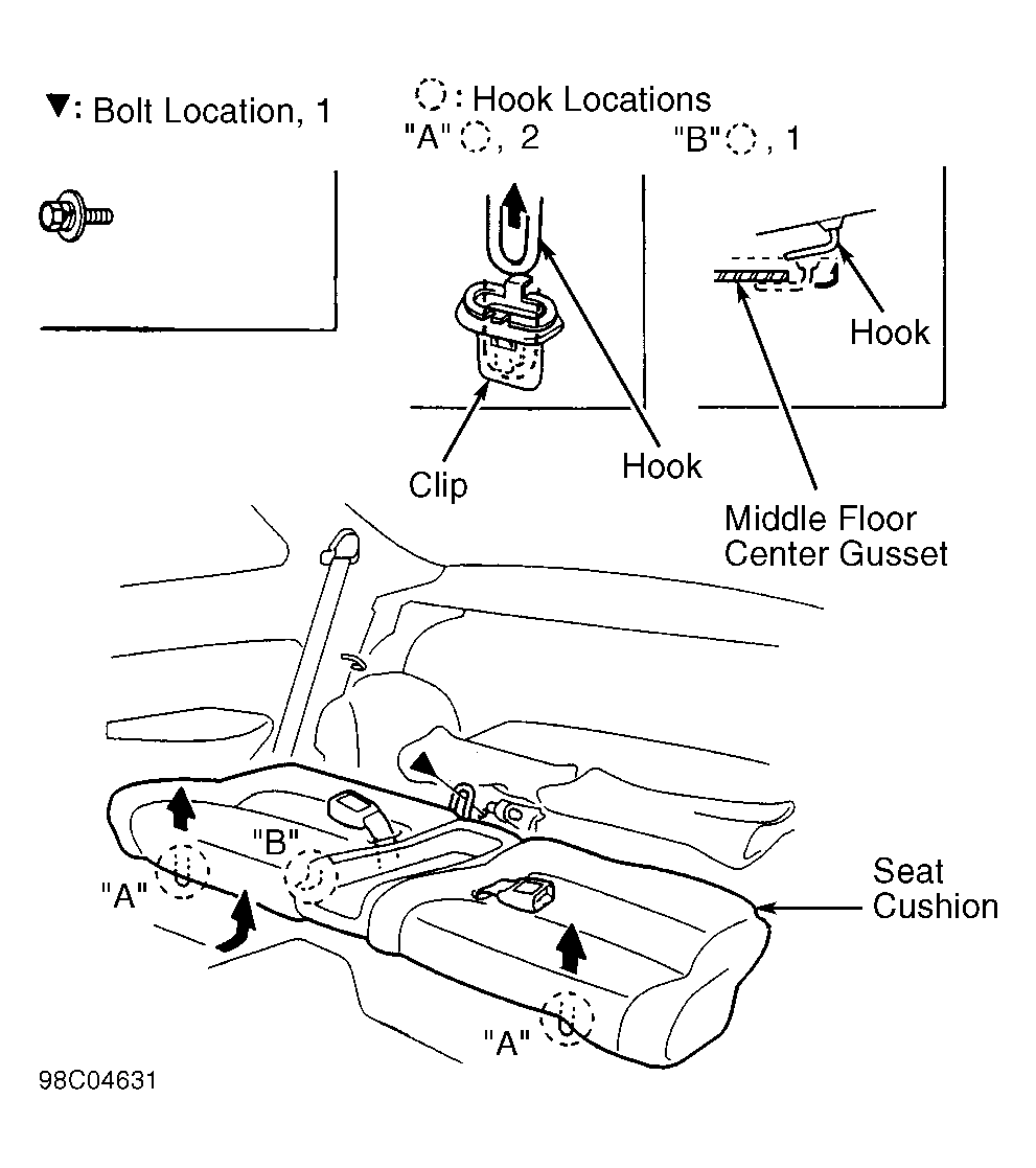 - Disconnect negative battery cable. On hatchback models, fold seat-backs forward. Remove clips securing trunk mat to seat-backs and remove trunk mat. Remove clip pin on both sides of seat. See Fig 1. Slide seat-backs outward and remove seat-backs from pivot bracket. See Fig 1. Remove bolts located behind center of seat cushion. Disconnect seat cushion securing hooks and seat cushion.