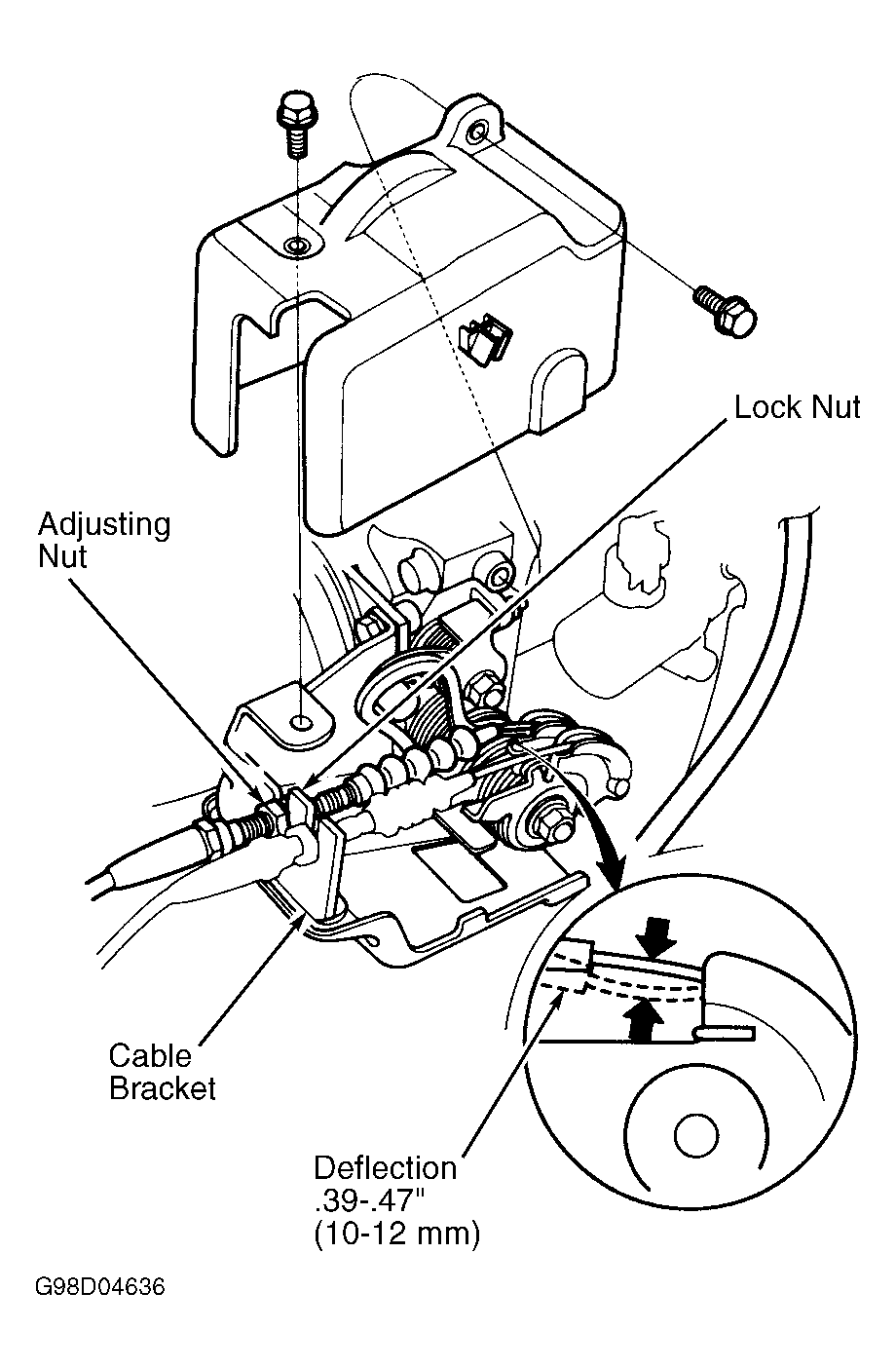 3. Remove throttle cable from part "A" of throttle bracket. Reinstall throttle cable in to part "B" of throttle bracket, so that bracket is now in between adjusting nut and lock nut. See Fig 1. Tighten lock nut. Throttle cable deflection should be 0.39-0.47 (10-12 mm) when measured between throttle link and cable bracket. See Figure.