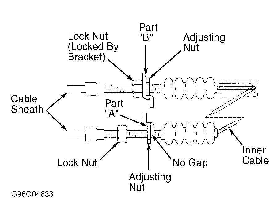 2. Ensure that throttle cable is not binding or sticking. Move both nuts toward cable sheath. Place throttle cable in to part "A" of cable bracket. See Fig 1. Hold throttle cable sheath, removing all slack from throttle cable. Turn throttle cable adjusting nut until it just touches part "A" of throttle cable bracket.