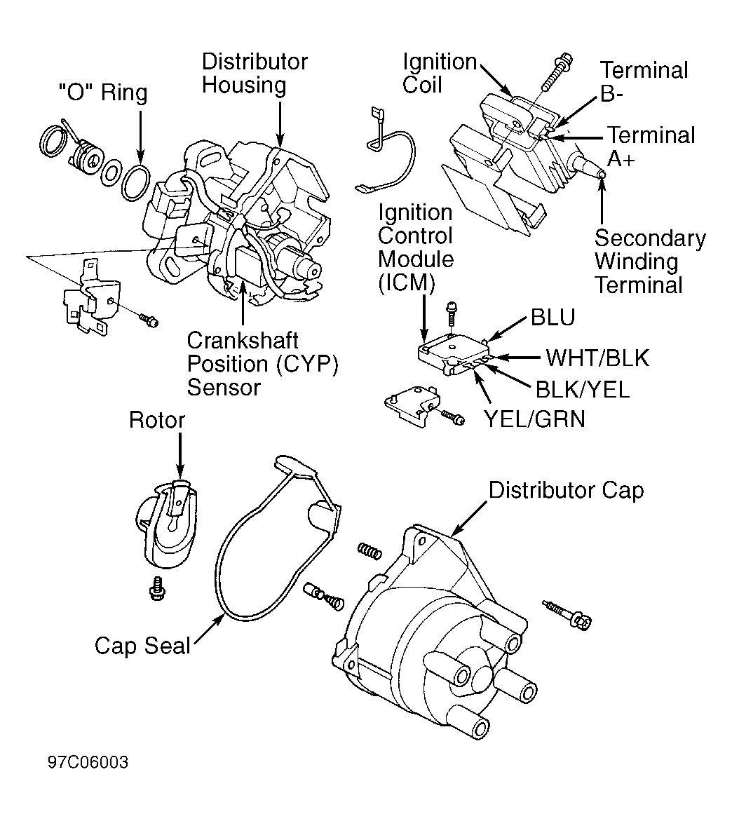 1. Turn ignition off. Remove distributor cap and rotor. Disconnect Yellow/Green, Black/Yellow, White/Black, and Blue wires from Ignition Control Module (ICM). See Figure. Turn ignition on. Check for battery voltage between ICM Black/Yellow wire and ground. If battery voltage exists, go to next step. If battery voltage does not exist, check for an open in Black/Yellow wire between ignition switch and ignitor wiring harness connector.