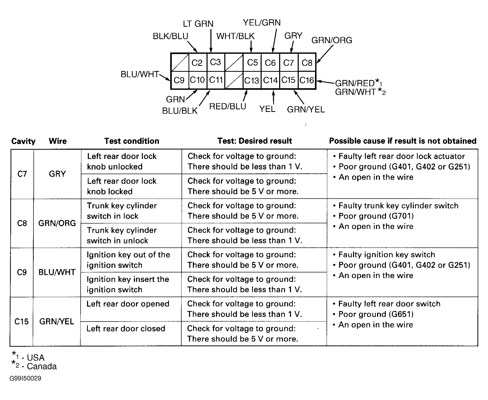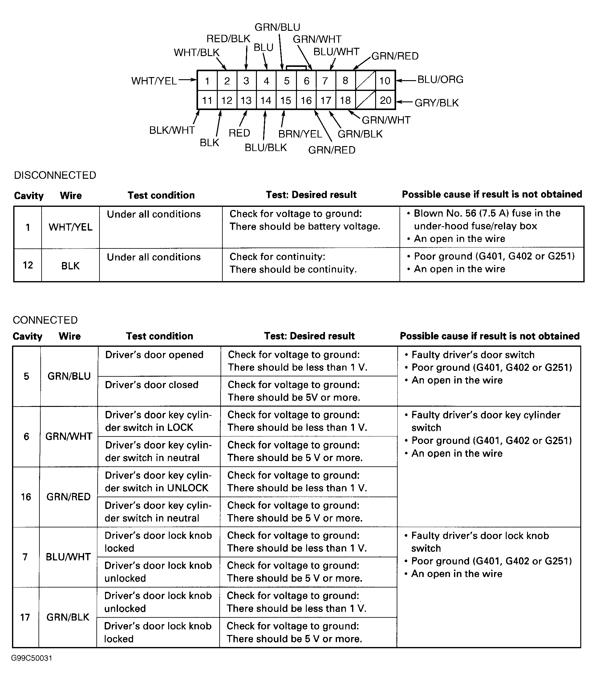 - Reconnect driver's door multiplex control unit connector. Perform second part of driver's door multiplex control unit input test at back of driver's door multiplex control unit connector (backprobe). See Fig 5
