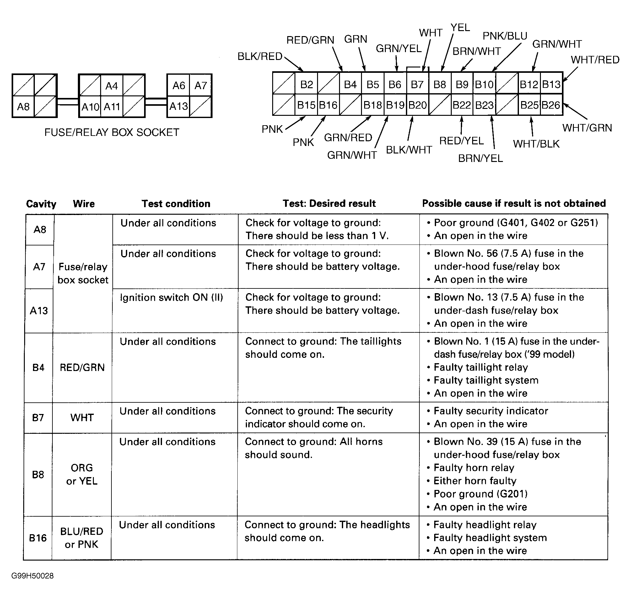 - Reconnect driver's multiplex control unit to driver's underdash fuse/relay box. Perform input tests at back of fuse/relay box (backprobe). See Fig 2