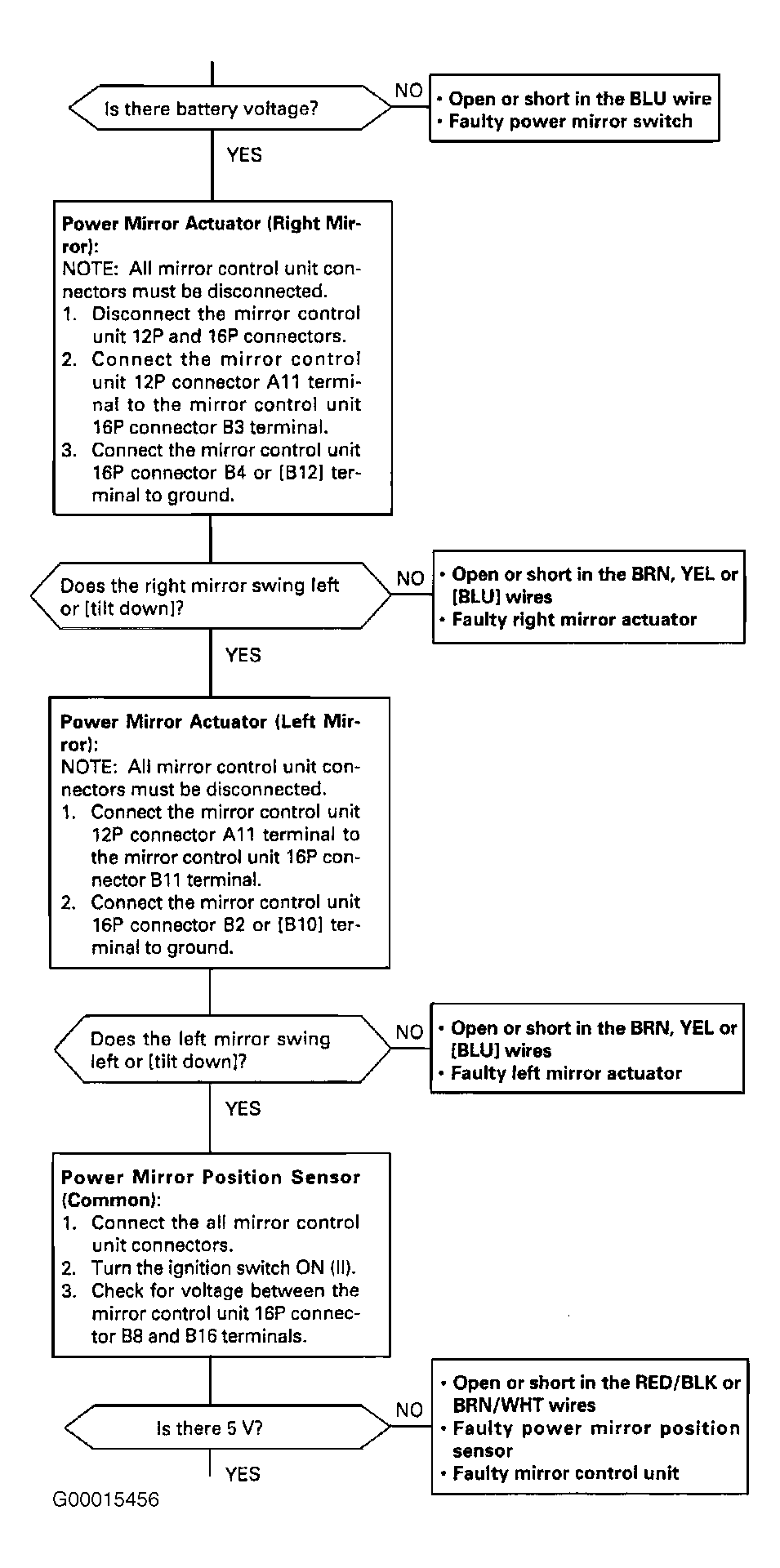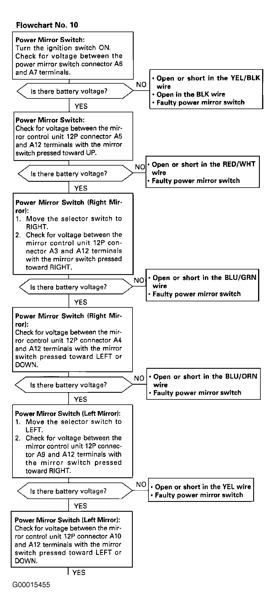 To test power mirror position sensor, perform procedures listed in flow chart No. 10. See Figure and Figure .