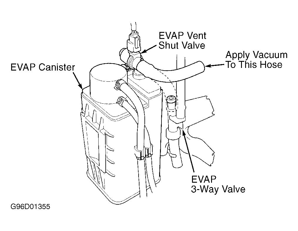 8. Turn ignition off. Disconnect vacuum hose from EVAP control canister vent shut valve. Connect vacuum pump to disconnected hose. See Fig 2. Turn ignition on. Apply vacuum to hose. If valve holds vacuum, go to next step. If valve does not hold vacuum, EVAP control canister vent shut valve is okay. Check for a possible vacuum leak at other components. If no vacuum leaks are present, replace PCM.