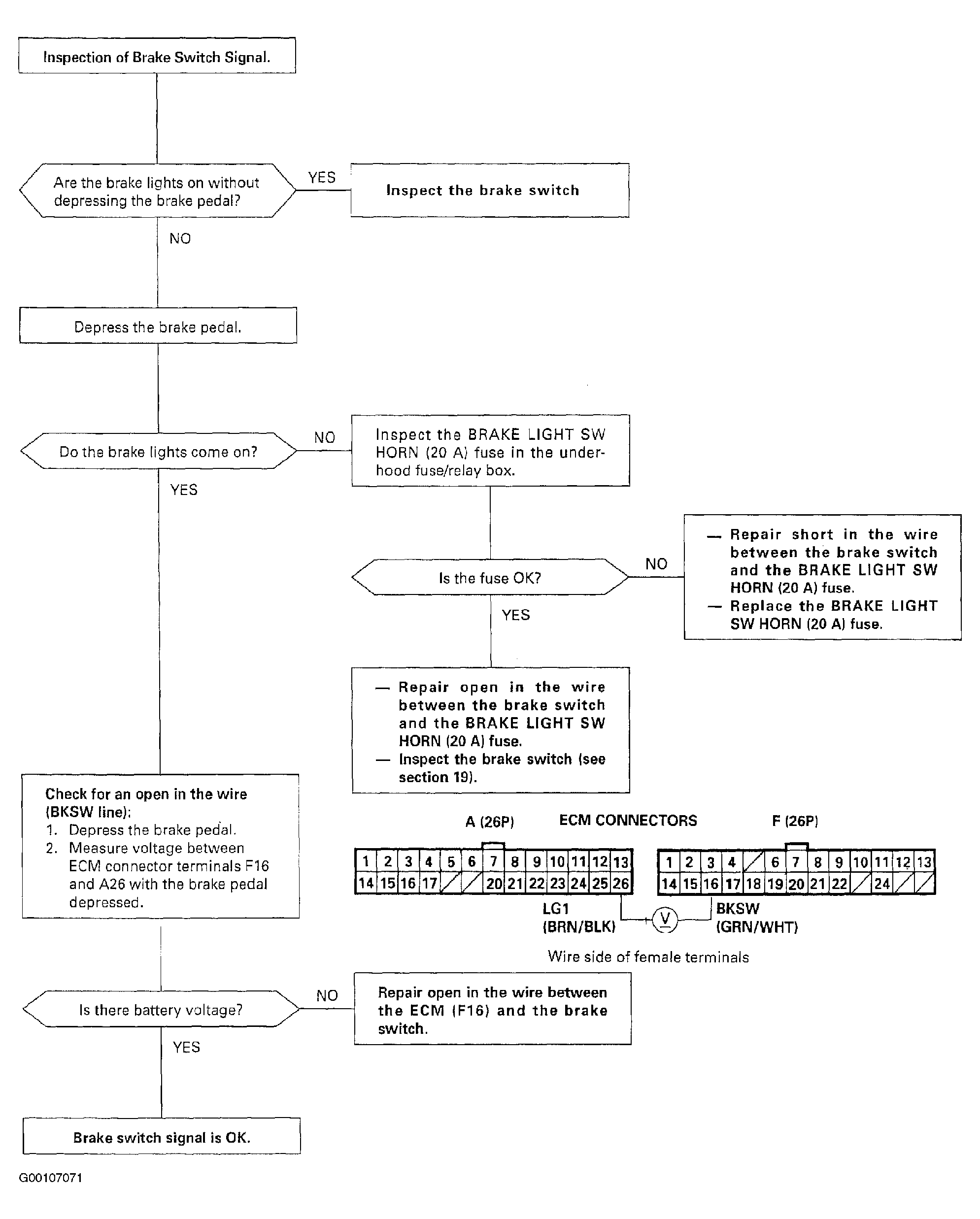 This signals the ECM when the brake pedal is engaged. For troubleshooting of the brake switch signal circuit, see Fig 1 .
