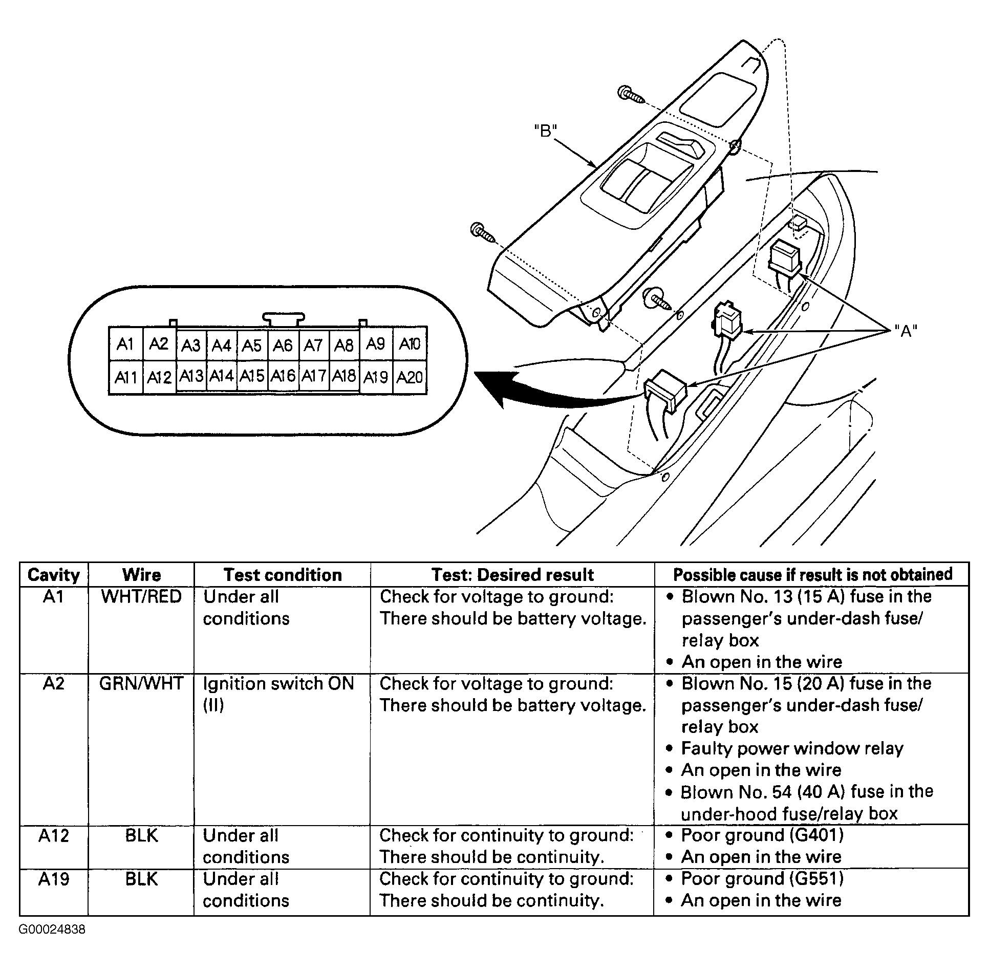 - Check continuity in Brown wire between terminal A15 of door multiplex control unit 20-pin harness connector and terminal A2 of driver's multiplex control unit 24-pin harness connector on driver's underdash fuse/relay box. See Figure and Figure . If continuity exists, go to next step. If continuity does not exist, repair open in Brown wire. After repairs, recheck DTCs.