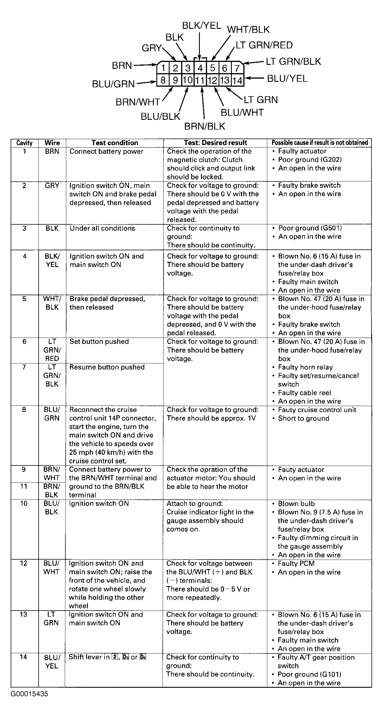 - Disconnect cruise control unit 14-pin connector. Ensure connector and terminals are okay. Repair as necessary and retest system. If connector and terminals are okay, perform cruise control unit input tests. See Figure . If an input test indicates a problem, find and correct cause and retest system. If all input test results are okay, replace cruise control unit.