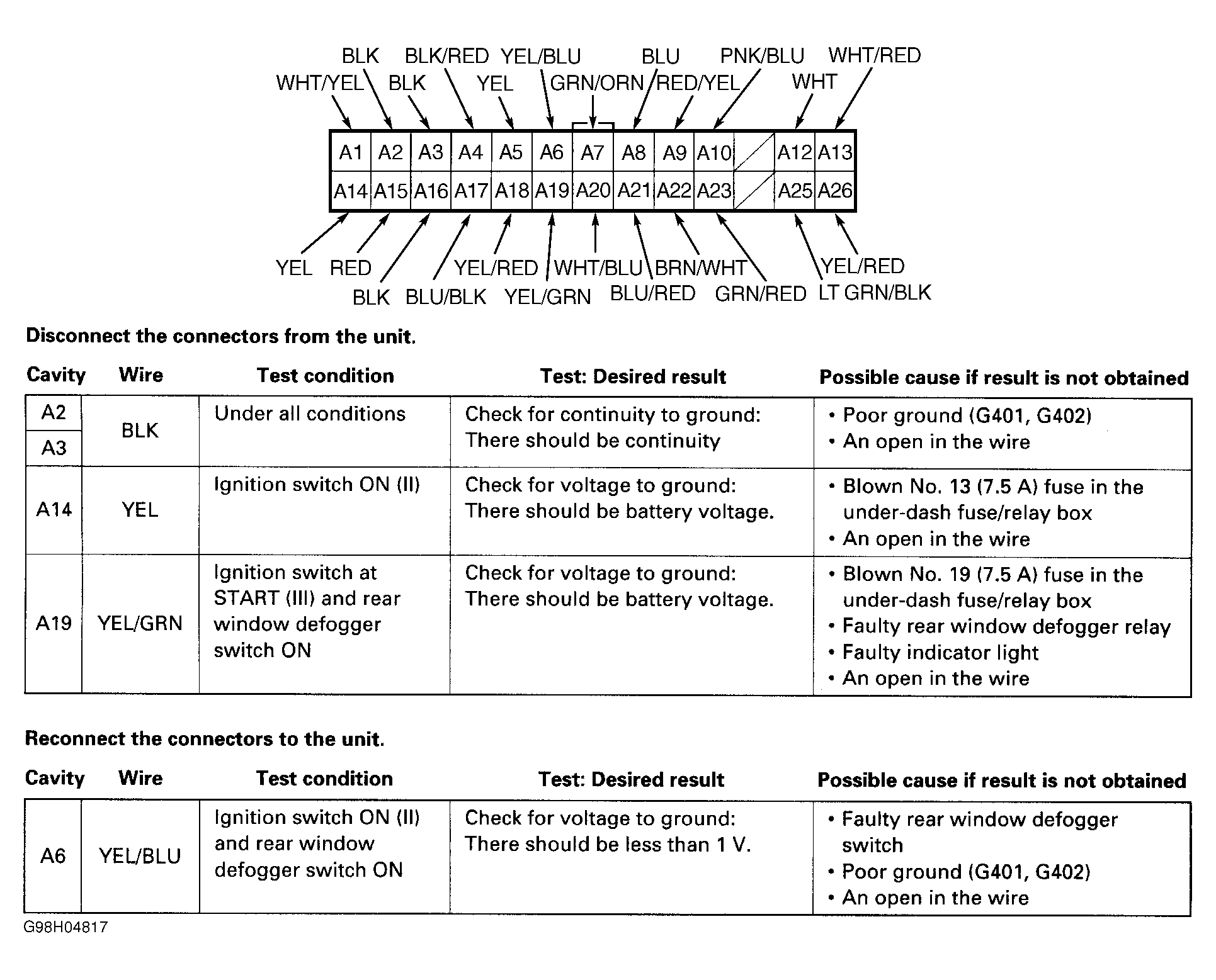 - Reconnect passenger's multiplex control unit connectors. Perform passenger's multiplex control unit input test "B" at back of passenger's multiplex control unit connector (backprobe). See Fig 1. Repair as necessary. If all input tests are okay, substitute known-good passenger's multiplex control unit and retest system. If problem is fixed, replace original passenger's multiplex control unit.