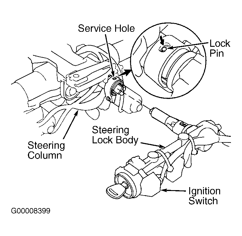 - Disable air bag system. See DISABLING SYSTEM under DISABLING & ACTIVATING AIR BAG SYSTEM. Remove steering column. See STEERING COLUMN ASSEMBLY . File notch into shear bolt head. Set tip of chisel in notch and loosen bolt by tapping on chisel. Remove shear bolt from switch body. Insert ignition key and turn to "ACC" (1) position. Push lock pin down and pull out steering lock body from steering column. See Fig 1.