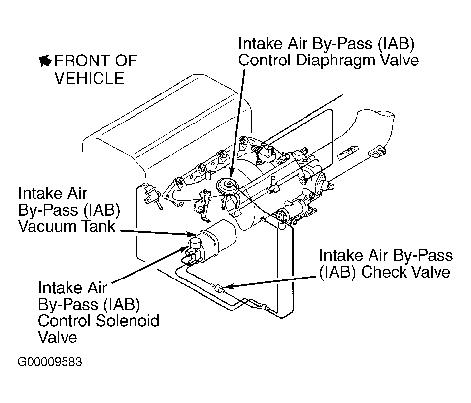 2. Remove vacuum hose from IAB vacuum tank. If vacuum exists at vacuum tank, go to next step. If vacuum does not exist at vacuum tank, repair blockage or vacuum leak between intake manifold and vacuum tank.