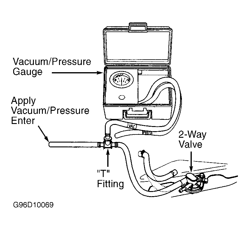 - Slowly apply vacuum while observing vacuum/pressure gauge. Vacuum should stabilize (valve opens) momentarily at 0.2-0.6 in. Hg. If vacuum stabilizes within specified range, go to next step. If vacuum stabilizes less than or more than specified range, replace EVAP 2-way valve and retest.