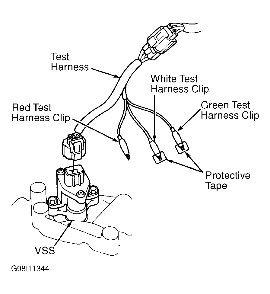 - Connect positive DVOM probe to White test harness clip, and connect negative DVOM probe to Red test harness clip. See Fig 1 . Turn ignition on. If battery voltage is present, go to next step. If battery voltage is not present, repair open in Black/Yellow wire between VSS 3-pin harness connector and fuse No. 15 (7.5-amp).