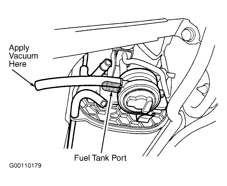 - Check fuel filler cap (Filler cap must say "If not tightened 3 clicks check engine light may come on"). Check fuel filler cap seal. Repair or replace as necessary and ensure cap is tightened at least three clicks. If filler cap, seal and pipe are okay, disconnect both vacuum hoses from EVAP 2-way valve. Connect vacuum pump to canister port on 2-way valve. See Fig 1 . Turn EVAP bypass solenoid valve on with scan tool, or connect fused jumper wire between ground and White ECM/PCM 31-pin "E" harness connector terminal No. 20 (Blue/Red wire). Turn ignition switch on. Apply vacuum with vacuum pump. If EVAP 2-way valve holds vacuum, go to next step. If valve does not hold vacuum, go to step 4 .